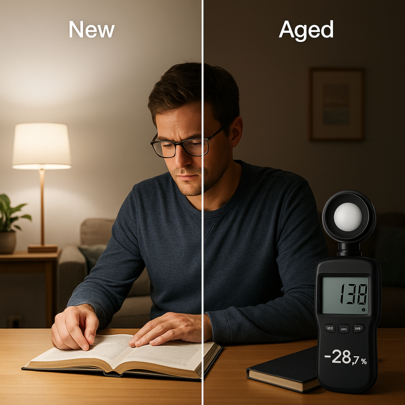 Светодиодные источники света имеют особенность: со временем они теряют яркость, но при этом продолжают излучать свет. Это явление называют световой деградацией. Визуально изменение яркости может быть почти незаметным, особенно если вы привыкли к освещению в помещении. Однако снижение светового потока на 20–30% уже сказывается на комфорте и зрении.