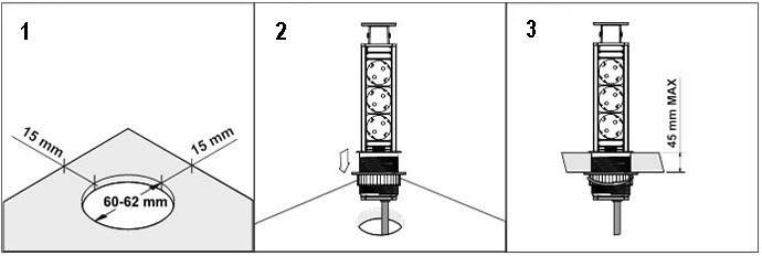- Подготовьте отверстие на рабочей поверхности диаметром 60 - 62 мм.