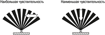 - Наибольшую чувствительность датчик движения имеет, когда движущийся объект перемещается перпендикулярно лучам зоны обнаружения.