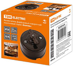 Выключатель поворотный "Болонь" TDM SQ1820-0410 (10 А, IP20, фарфор) открытой установки, с ручкой, коричневый