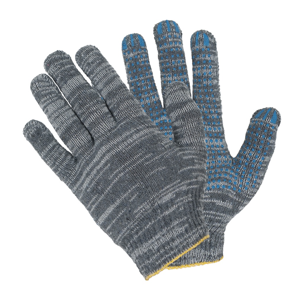 Вязаные перчатки с точечным ПВХ напылением на ладонной части являются самым распоространенным средством защиты рук при проведении строительных, садовых, сборочных и других видов работ. Грубая вязка и смешанный состав пряжи повышают износостойкость перчаток и продлевают срок их службы. Точечное ПВХ покрытие обладает антискользящими свойствами, что обеспечивает хорошее сцепелние пальцев рук с предметами.