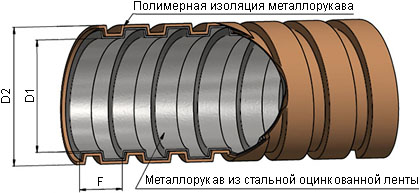 - Металлорукав МРПИ нг состоит из негерметичного металлорукава из оцинкованной стали, на внешнюю сторону которого нанесено не поддерживающее горение поливинилхлоридное покрытие.