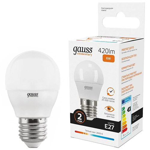 Лампа светодиодная Gauss 53216 Elementary (G45 шар, E27, 6 Вт, 420 лм, 3000 К)