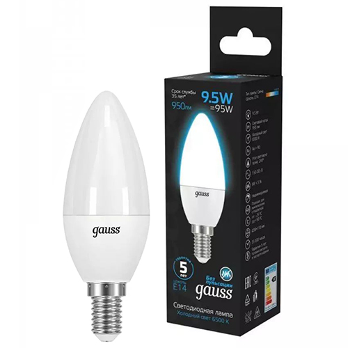 Лампа светодиодная Gauss 103101310 (свеча, Е14, 9,5 Вт, 950 лм, 6500 К)