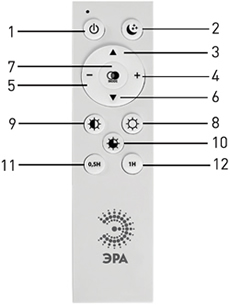 1 - включение / выключение светильника. 3 - увеличение яркости. 5 - уменьшение цветовой температуры. 7 - переключение цветовой температуры (3000 К - 4200 К - 6500 К) - при этом светильник будет светить с максимальной яркостью. 9 - яркость светильника - 50%. 11 - установка таймера отключения на 30 минут (автоматическое отключение светильника через 30 мин.). |