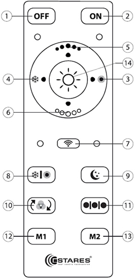|  | 1 - кнопка выключения. 3 - регулировка цветовой температуры (к теплому белому цвету свечения). 5 - регулировка яркости (увеличение). 7 - подключение. 9 - режим "ночник". 11 - ручное переключение цвета свечения / режима RGB подсветки. 13 - память № 2. |