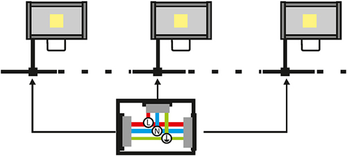 - Подключение прожектора к сети производится с помощью клеммной колодки.