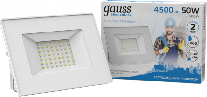 Прожектор светодиодный Gauss 613120350 Elementary (50 Вт, 4500 лм, 6500 К, IP65), белый