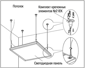 Подвесной монтаж светодиодной панели осуществляется с помощью комплекта крепежных элементов № 2 IEK.