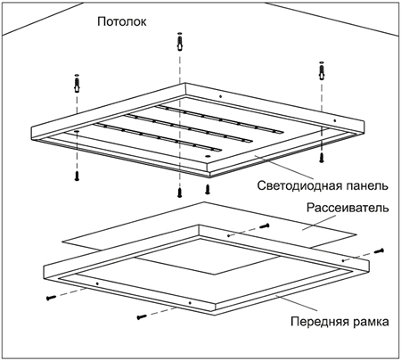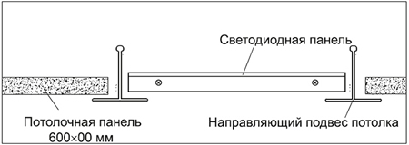 Светодиодную панель устанавливают на место потолочной плиты 600 x 600 мм в межпотолочное пространство.